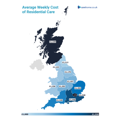 - South East England: Residential care averages £1,446 per week.